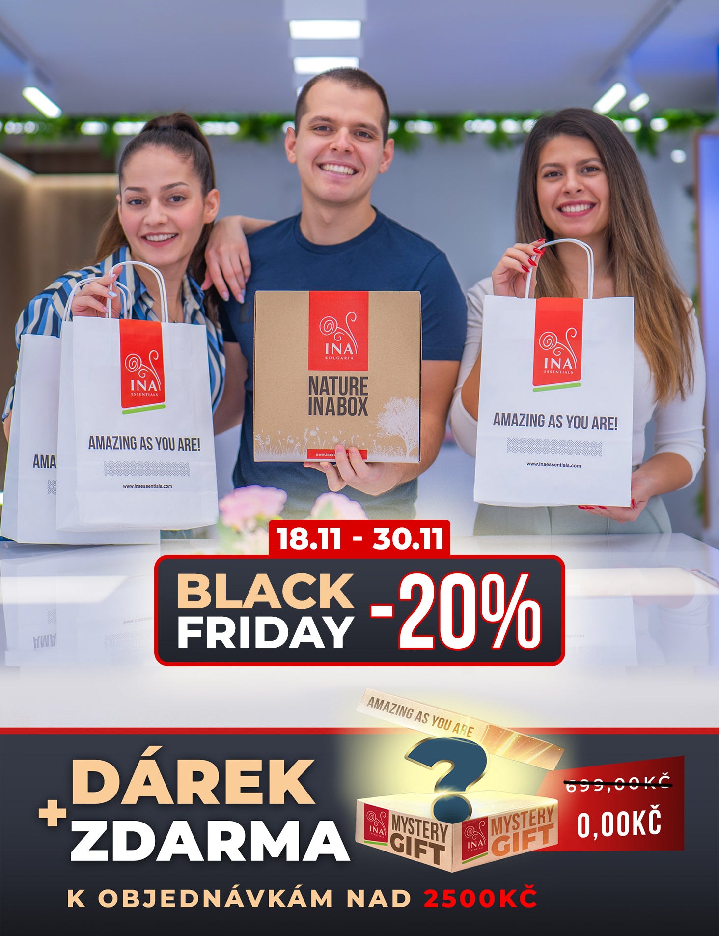Užijte si kompletní zážitek s přírodními produkty InaEssentials. Produkty dodáváme v “Nature INA boxu” - jedná se o designovou a plně recyklovatelnou kartonovou krabici, která zachycuje historii a hodnoty naší rodiny. Těmi hlavními hodnotami je péče o přírodu a o vás, naše zákazníky.