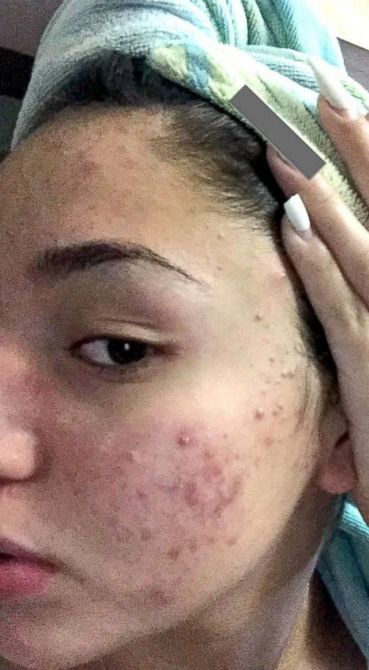 Maria, 17 let, sdílela tuto fotografii svého těžkého akné pořízenou předtím, než se jí podařilo pleť vyčistit pomocí pečující rutiny založené na jednom organickém produktu.
