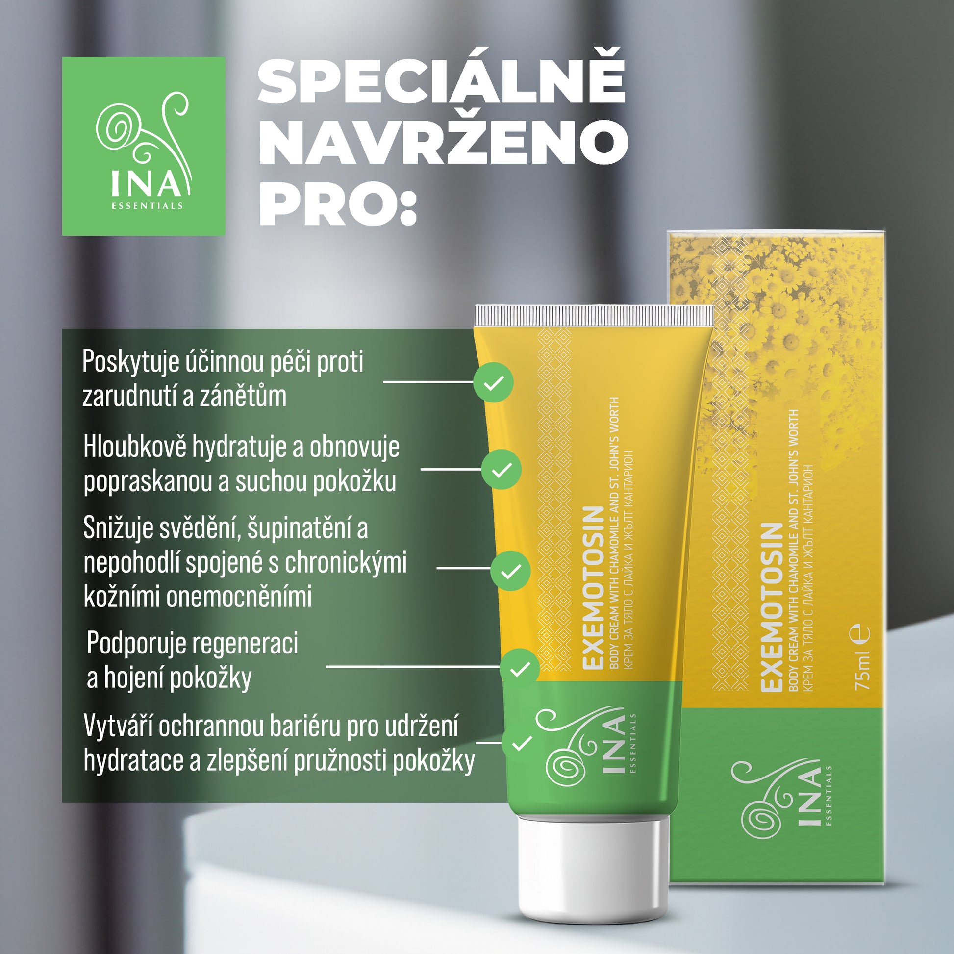 Exemotosin od InaEssentials je vysoce kvalitní, jemný, vyživující krém bez parfemace s přírodními účinnými látkami. Je speciálně vyvinut pro potřeby suché, šupinaté, svědivé a zarudlé pokožky, včetně kožních problémů, jako je lupénka a ekzém.