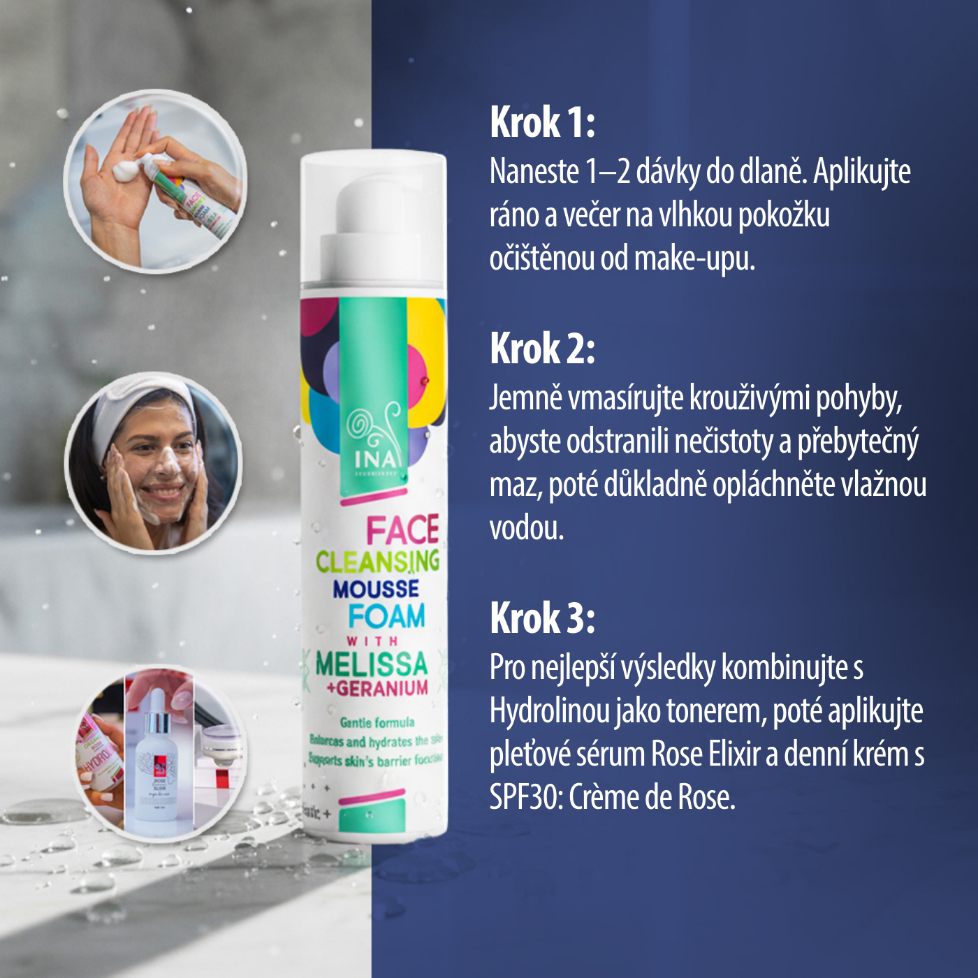 Čisticí pěna na obličej InaEssentials má univerzální a jemné složení, které je vhodné pro všechny typy pleti. Vysoká koncentrace prebiotik působí příznivě na mastnou a aknózní pleť a pomáhá udržovat zdravý a vyvážený vzhled. Geraniový olej a extrakt z aloe vera současně vyživují a zklidňují suchou pokožku, zatímco meduňková voda ji osvěžuje a regeneruje.